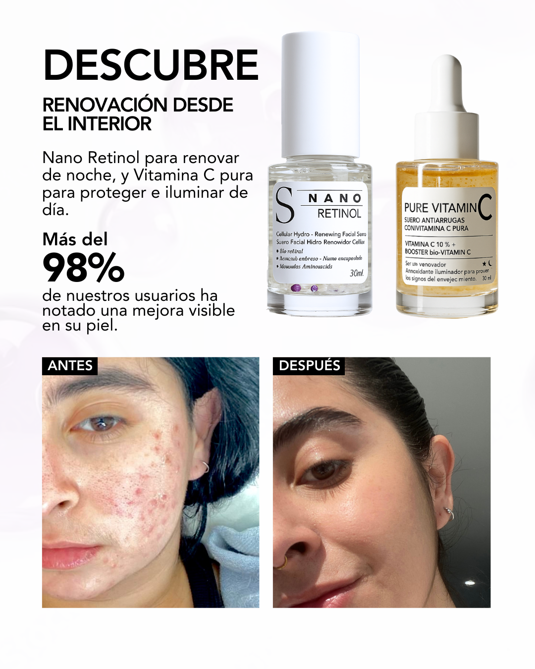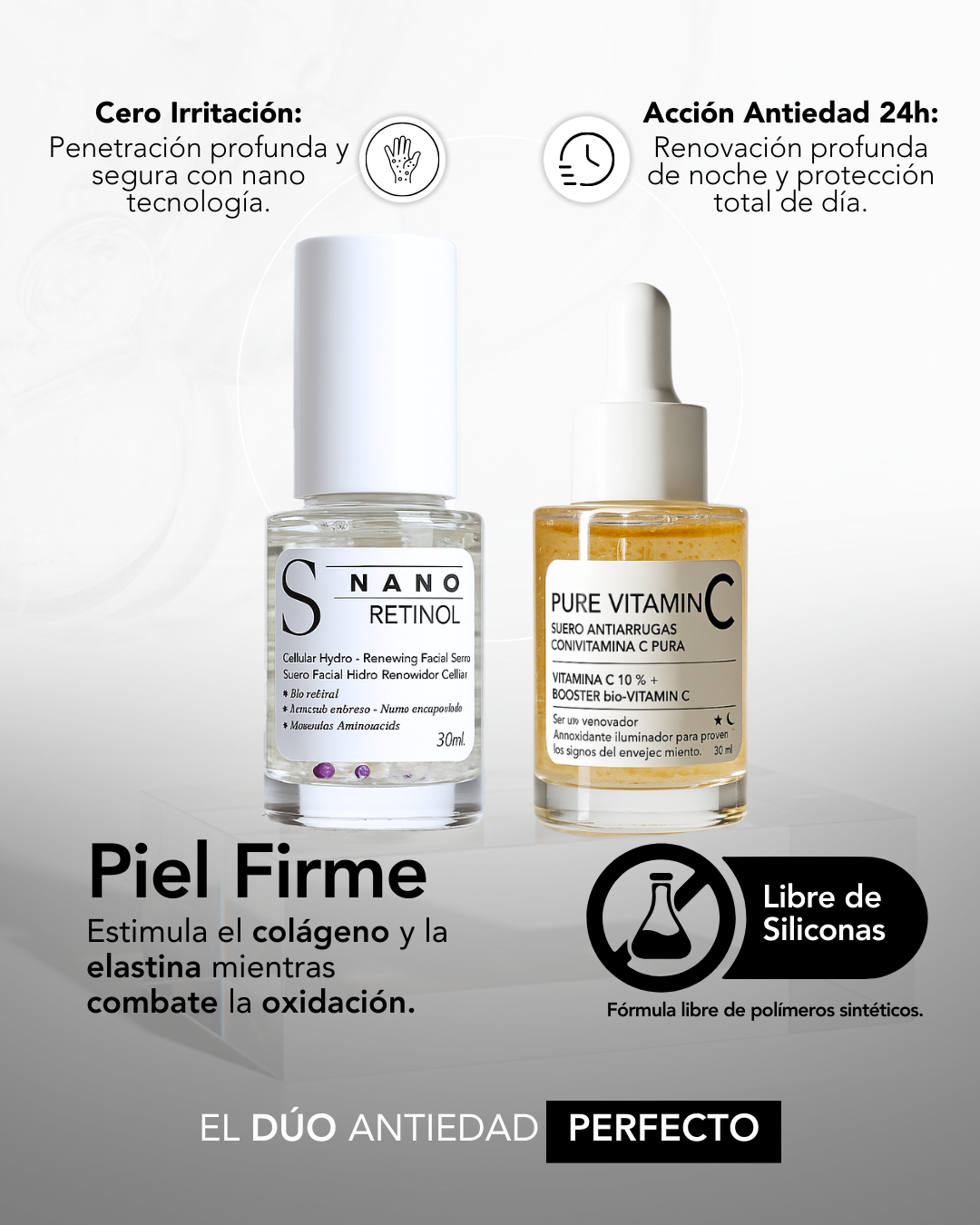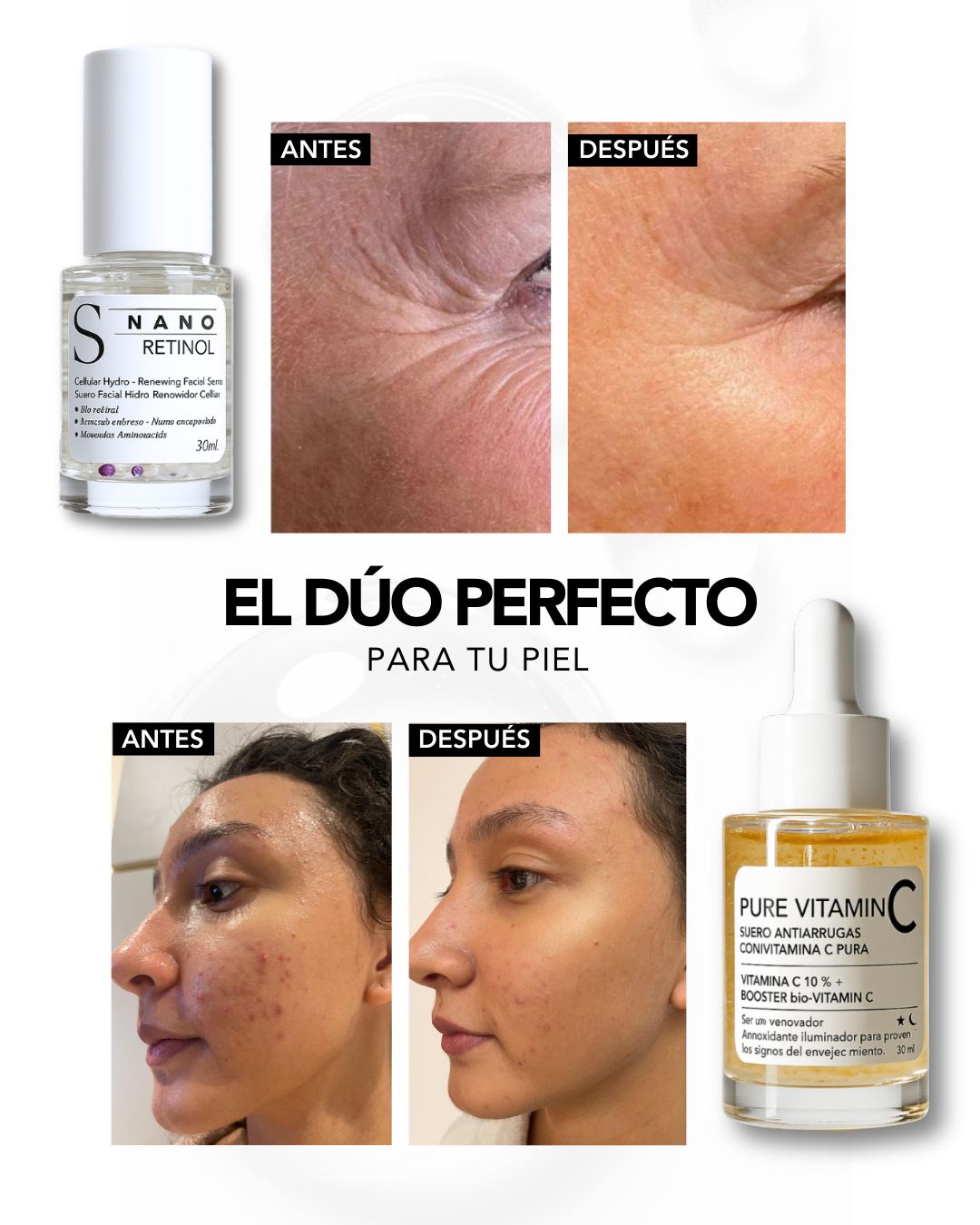 Este dúo combina la ciencia de la renovación nocturna (Nano Retinol) y la protección e iluminación diurna (Pure Vitamin C) para ofrecer una solución antiedad completa.