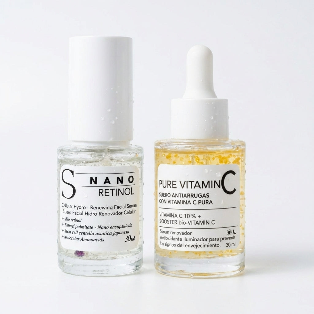 La sinergia perfecta: Nano Retinol (Centella Asiática y Aminoácidos) trabaja de noche estimulando colágeno y reparando daños, mientras que Pure Vitamin C (Camu Camu y Regaliz) actúa de día iluminando, unificando el tono y ofreciendo una defensa antioxidante continua contra el estrés ambiental.