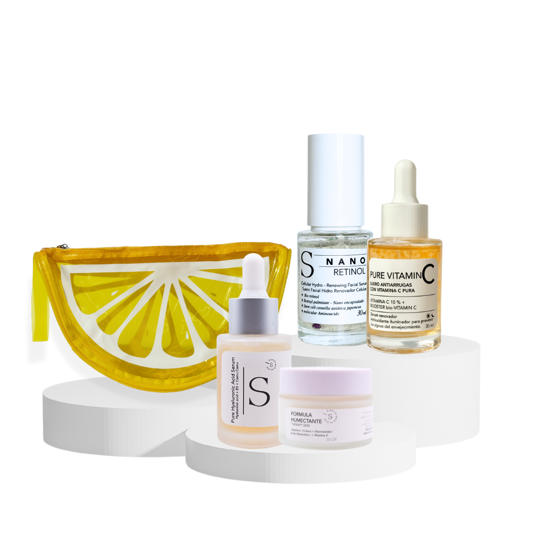Restaura la firmeza, ilumina tu piel y potencia la hidratación con el Kit Antiedad Sole Paris. Una rutina avanzada con ácido hialurónico, nanoretinol y triple vitamina C nanoencapsulada, diseñada para renovar la piel y devolverle su luminosidad natural. Incluye cosmetiquera de regalo.