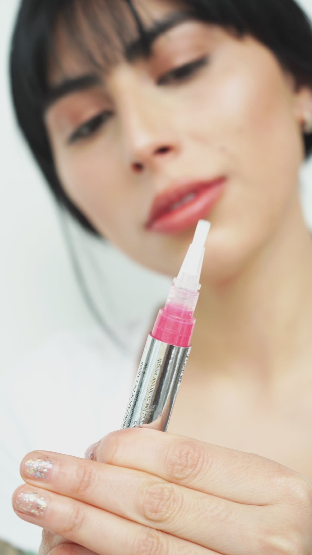 Acciona la brocha y aplica una cantidad generosa y abundante en tus labios, hasta que queden completamente cubiertos aplica tambien en su contorno, dejar secar y acontinuación puedes aplicar maquillaje, labial o brillo después de secarse el producto.