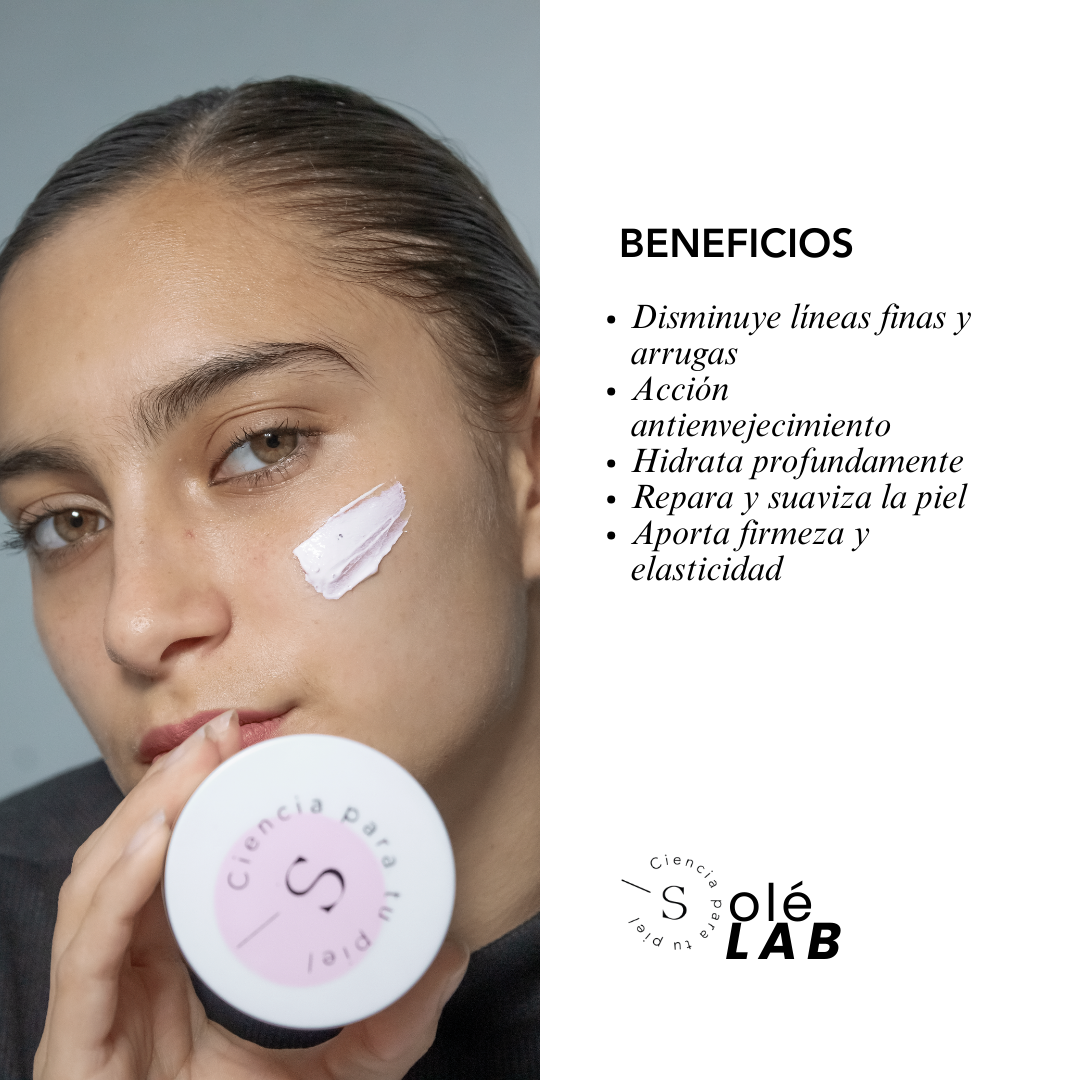 Mascarilla Orgánica formulada con ácido hialurónico, aminoácidos de seda y concentrado de uva pura que le confieren propiedades Antiedad, antienvejecimiento, hidratantes, reparadora y emolientes. Mejora el aspecto de las lineas finas de expresión.