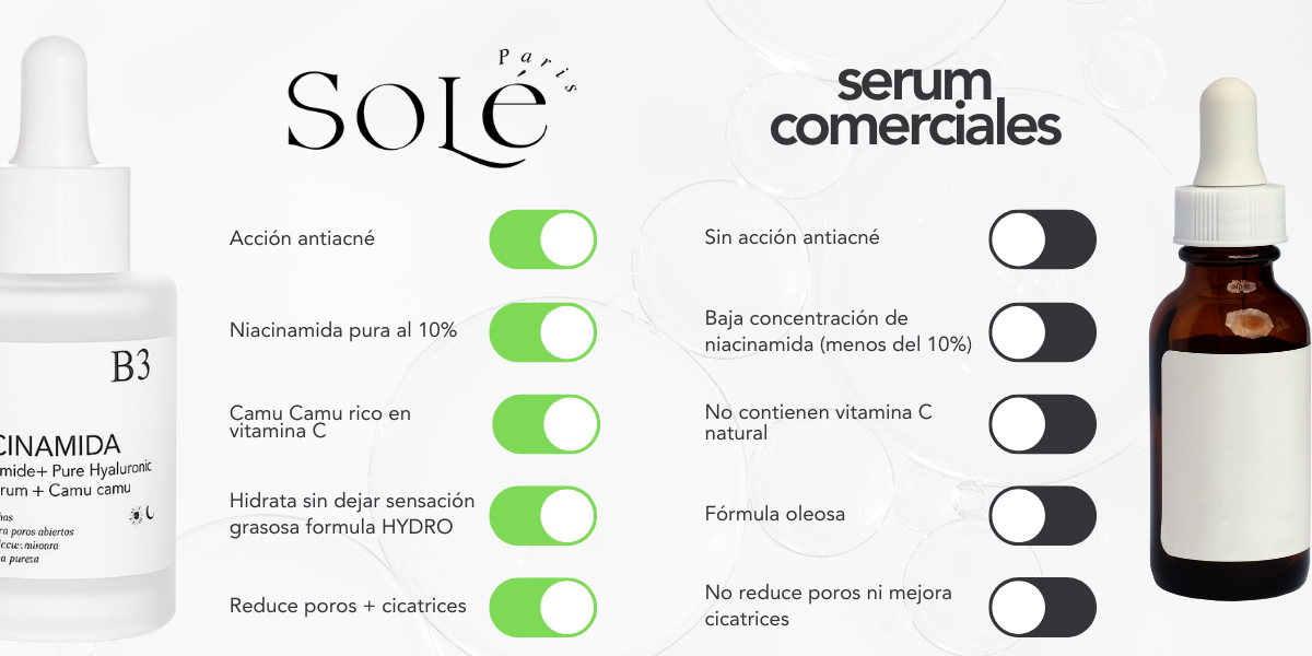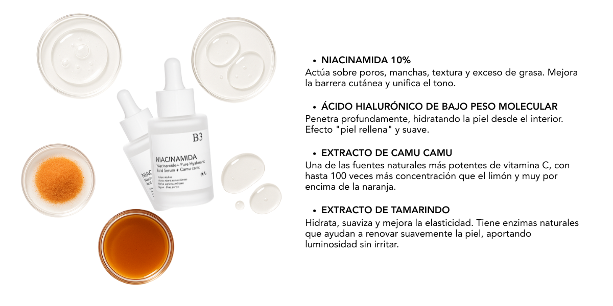 Sérum orgánico con Niacinamida 10%, Camu Camu y Ácido Hialurónico que controla grasa, combate el acné, reduce poros, hidrata, mejora cicatrices y aclara manchas al instante.