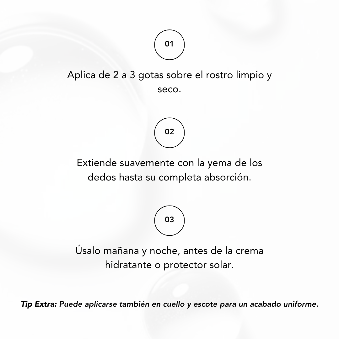 Aplica 2 a 3 gotas sobre rostro, cuello y escote. Utiliza mañana y noche sobre la piel limpia y seca. Masajea suavemente hasta su completa absorción.