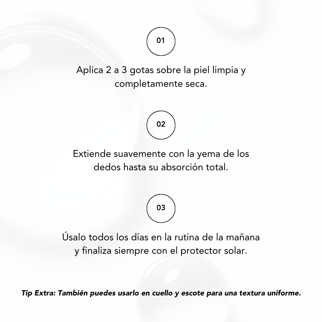 Aplica de 3 a 5 gotas sobre rostro, cuello y escote después de la limpieza. Masajea suavemente hasta que el producto se absorba por completo y sigue con tu hidratante. Finaliza con protector solar por la mañana para maximizar los efectos antioxidantes.
